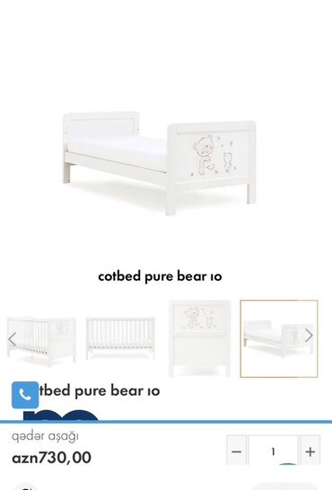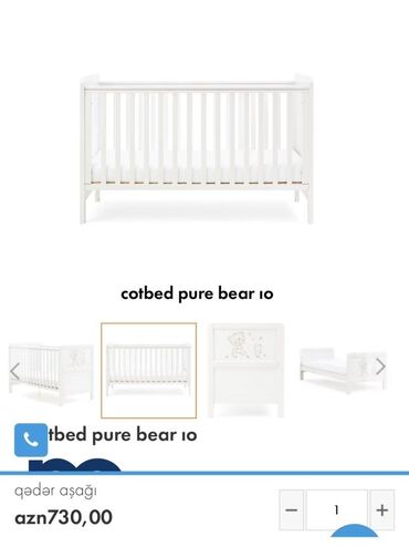 Şəkillərdə rəsmi səhifə məlumatında “cotbed pure bear 10” modeli və qeyd olunan qiymət: azn 730,00.