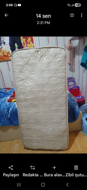 Tek nəfərlik döşək - Ölçü: təxminən 80–90 x 190–200 sm (standart single ölçü kateqoriyasında) - Rəng: krem/bej - Quruluş: ortopedik tikişli üst qat, kənarlarda möhkəmləndirilmiş bort; yanlarda hav...