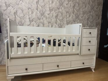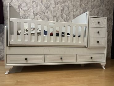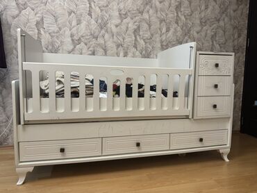 Dəst/komplektdə görünənlər: beşik korpusu, sürüşən barmaqlıqlar, 3 alt çekmece, yan komod 3 çekmecəli.