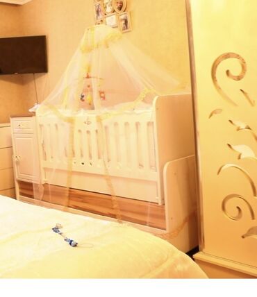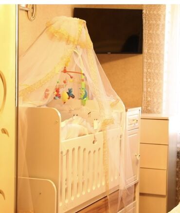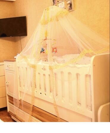 - Dəst: üst hissədə matrass, körpə mərhələsində asılan oyuncaq-karusel üçün rels, ağ-sarı haşiyəli cibinək (tül) ilə göstərilib.