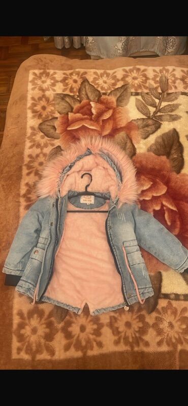 Uşaq üçün cins jaket (qızlar) – Overdo brendi - Ölçü: 4 yaş / 104 sm (etiketdə göstərilib) - Material: xarici hissə klassik mavi denim, daxili hissə və kapüşon tamlıqla qalın, yumşaq tükcüklü/plyu...