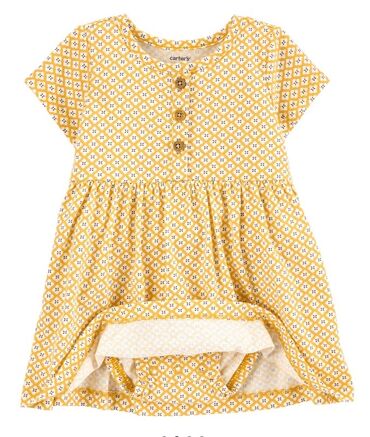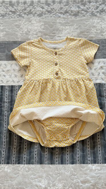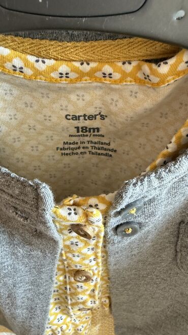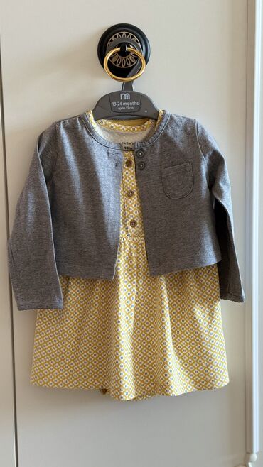 Carter's markalı, sarı rəngli, üzərində naxışları olan, uzunqol boz rəngli jaket ilə komplektləşdirilmiş uşaq donu. Donun ön hissəsində düymələri var. Olcu 12-18 ay