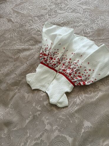- Rəng: İvory/ağ əsas, ətək hissəsində qırmızı çiçək və xırda naxışlar; bel xəttində qırmızı atlas lent.