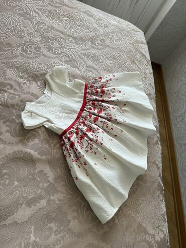 Ağ rəngli qız uşaq paltarı 1 dəfə istifadə edilib - Model: klassik A-kəsim, ətəyi dalğalı və həcmlidir - Material: parıldayan atlas/şifon tipli parça, yüngül və zərif - Rəng: saf ağ - Üst hissə: qo...