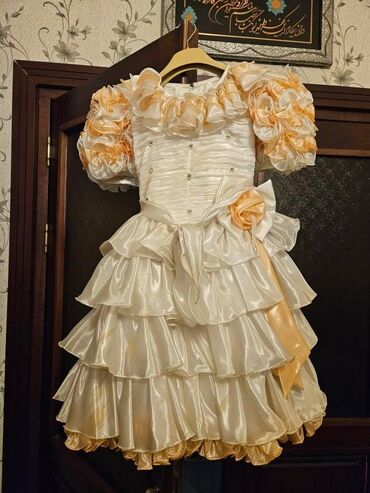Uşaqlar üçün bayram donu - Rəng: krem/şampan tonlarında - Ölçü etiketi: 2-3 yaxşı - Üst hissə: qısaqol, rellefli çiçək naxışlı parça - Bel hissəsi: toxuma kəmər, iri dekorativ gül kompozisiyası, ...