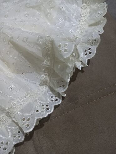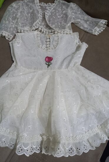Ağ rəngli qız uşaq paltarı 1 dəfə istifadə edilib - Model: klassik A-kəsim, ətəyi dalğalı və həcmlidir - Material: parıldayan atlas/şifon tipli parça, yüngül və zərif - Rəng: saf ağ - Üst hissə: qo...