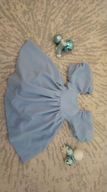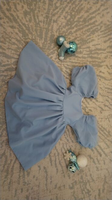 Uşaq donu – açıq mavi rəngdə, qısa və həcimli “puf” qollarla. Klassik geniş ətəkli kəsim, bel hissəsində yığımlar var. Yumşaq, axıcı parça; rahat geyinmə üçün elastik qol ucları. Dairəvi boyun xətti, beldən aşağı bol düşüş. Günlük və ya bayram kombinləri üçün uyğundur, saç aksessuarları və çoraplarla asanlıqla uyğunlaşır. Şəkildə bəzək əşyaları vizual məqsədlidir.