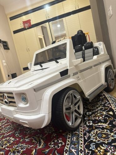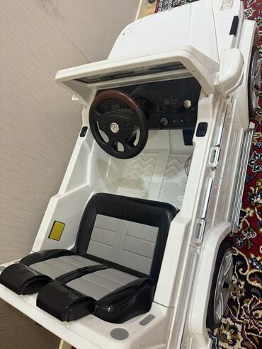 Uşaq üçün elektrikli akkumulyator maşını – ağ rəngdə, kabriolet tipli kuzov. G-klas üslubunda detallarla hazırlanıb: iri təkərlər, xrom dekor elementləri, ikioturacaqlı salon və təhlükəsizlik kəmərləri görünür. Ön paneldə dekorativ “V8” nişanı, qapaqda hava çıxışı və işıq blokları var.