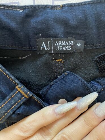 - Tünd göy cins: ciblər üzərində xırda daş bəzəkləri, sarı tikiş detalları. Etiket: AJ Armani Jeans.