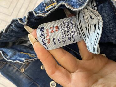 - Klassik mavi cins: ön hissədə metal halqa/aplikasiya detalları və azacıq aşınma effekti. Daxili tənzimlənən rezinli bel. Etiketdə: Pepino Kids Fashion, ölçü 6-7 yaş (116 sm), tərkibi 98% pambıq, 2% elastan, Türkiyədə istehsal.