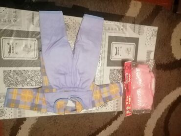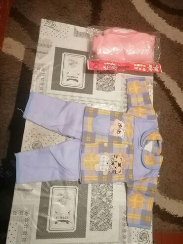 - Uşaq pijama/kombinezon dəsti: bənövşəyi-sarı rəngli, dama və çiçək motivli qalın materialdan. Üstdə düyməli kofta, altda elastik bel və balaqları rezinli şalvar. Ön tərəfdə şirin heyvan aplikasiyaları və ciblər. Arxa tərəfdən bağlanma düymələri mövcuddur.