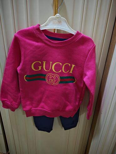 - Üst: parlaq çəhrayı rəngdə uzunqollu sweatshirt, ön hissədə qızılı rəngli “GUCCI” yazısı və yaşıl-qırmızı zolaqlı loqo qrafikası. Dairəvi yaxa, ətək və qollar rezinli büzməli haşiyə ilə.