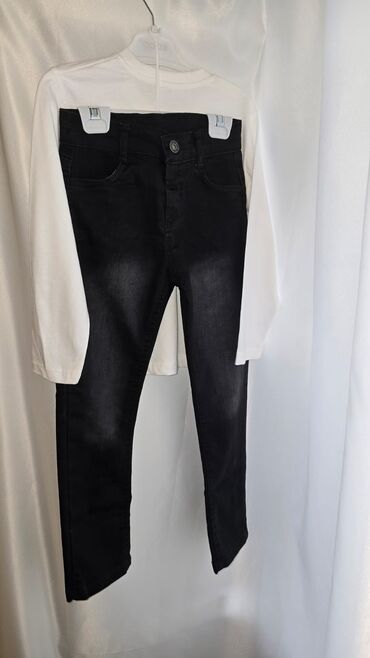 - Qara rəngli şalvar/cins şalvar. Klassik 5 cibli kəsim, ön tərəfdə düymə və gizli fermuar.
