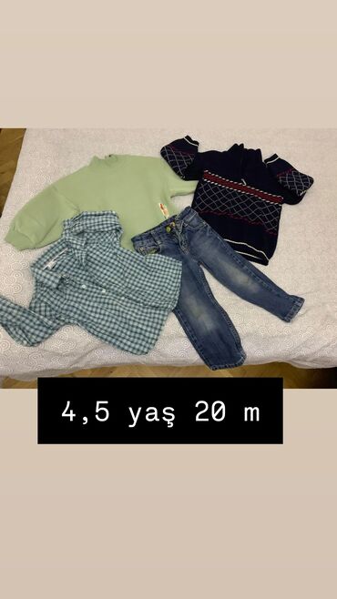 - 4,5 yaş üçün dəst – 20 m: açıq yaşıl svitşört, tünd lacivərt naxışlı triko sviter (yarımfermuarlı), mavi-qara cins şalvar, yaşıl-çəhrayı xanalı uzunqollu köynək.