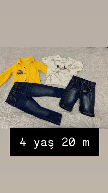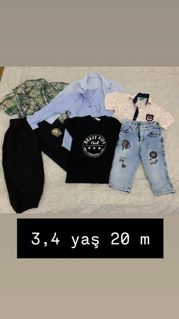 - 3-4 yaş üçün dəst – 20 m: 2 ədəd köynək (yaşıl xanalı, açıq mavi), qısaqoll ağ-çəhrayı xırda naxışlı köynək, qara T-shirt “Brave Kids Club”, açıq mavi cins şalvar (nişanlı/applikasiyalı), 2 ədəd qara şalvar (idman tipli).