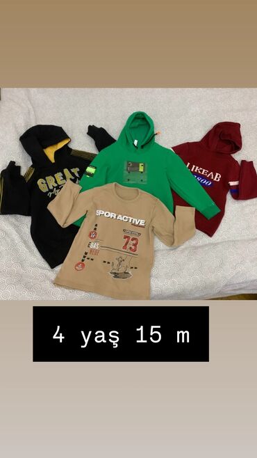 - 4 yaş üçün dəst – 15 m: 3 ədəd kapüşonlu sviter/svitşört (qara “GREAT”, yaşıl, tünd qırmızı “LIKEAB”), 1 ədəd bej uzunqollu köynək (SPORACTIVE, 73 çaplı).
