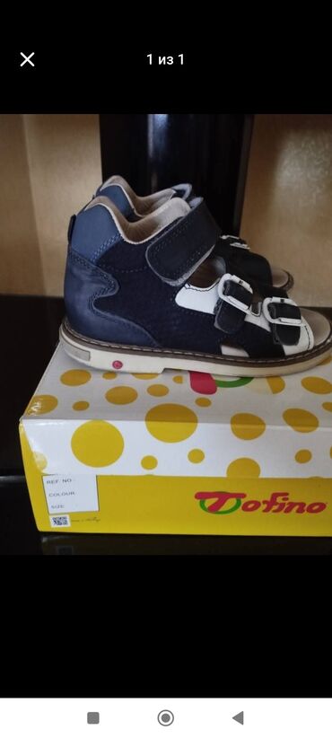 - Uşaq sandal/kəpənək tipli ortopedik ayaqqabı: Tünd göy-ağ rəng kombinasiya. İki tənzimlənən tokalı qayış və üst hissədə əlavə yapışqanlı (Velcro) bağlama. Sərt daban, rahat altlıq, tikişli kənar, sürtünməyə davamlı altlıq. Qutusu ilə birlikdə. Markası: Dofino.