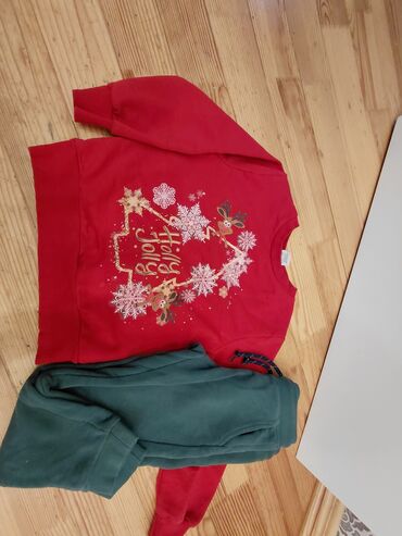 1) Qırmızı Yeni il temalı svitşot + tünd-yaşıl trikotaj idman şalvarı