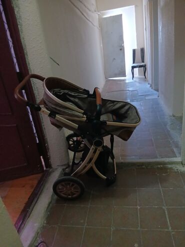 Uşaq arabası – klassik beşik tipli, qara rəngli quilted (romb tikişli) parça ilə. Qızılı/alüminium rəngli möhkəm metal şassi, tək hərəkətlə qatlanan konstruksiya. GÜT SATILIR 120 MANAT O BİRİ KARE...