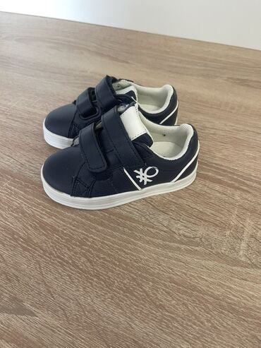 Uşaq üçün idman üslublu ayaqqabı cütü. - Rəng: tünd göy (dənim/parça və dəri effektli hissələrin kombinasiyası), ağ altlıq - Bağlanma: velkro (iki ədəd yapışqan qayış – tez və rahat geyinmə) - Diza...