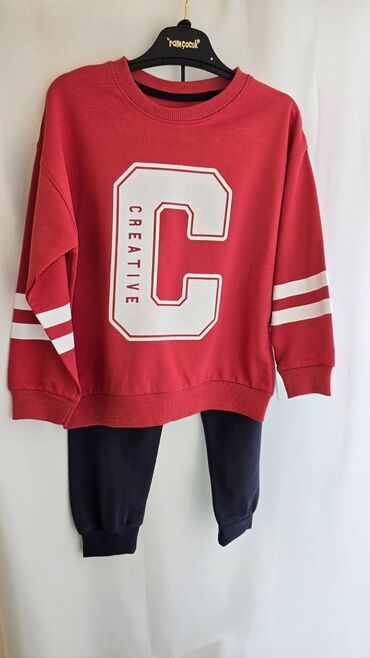 - Üst: qırmızı rəngli sweatşört, ön hissədə iri “C” və “CREATIVE” yazısı, qollarda iki ədəd ağ zolaq. Yuvarlaq yaxa, manjetli qol və bel hissəsi.