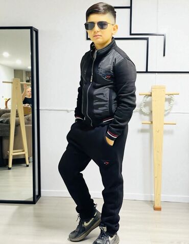 Uşaq geyim dəsti – HONE BABY, ölçü 160 Tərkib: - Qara və mavi rəng kombinasiyalı sweatshirt: yarım-fermuarlı (half-zip), boğazı rezinli, uzunqol. Qollar iki rəngli panellərlə dizayn edilib. - Cins...