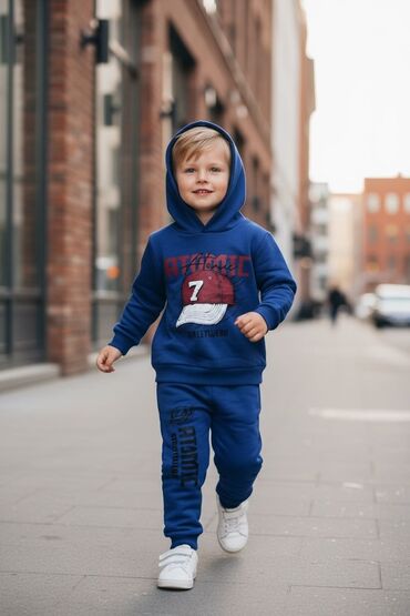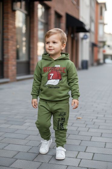 Uşaq idman dəsti – kapüşonlu svitşot və şalvar - Model: 2 hissəli uşaq trikotaj dəsti - Üst: kapüşonlu svitşot, ön tərəfdə kenguru cib, sinədən aşağı enən kontrast ağ zolaq, sinədə kvadrat “1701/1...