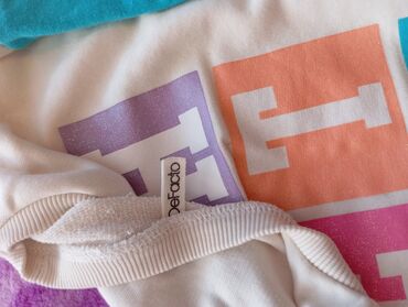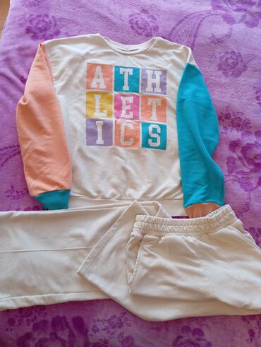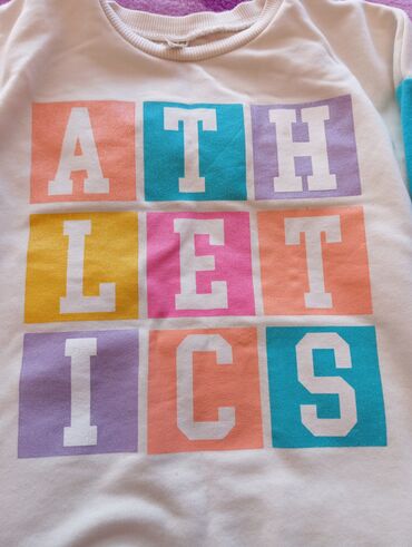 • Rənglər: krem ağ əsas, qol hissələri şaftalı və firuzəyi kontrast, ön hissədə “ATHLETICS” yazısı olan rəngli kvadrat print (yüngül parıltılı effekt)