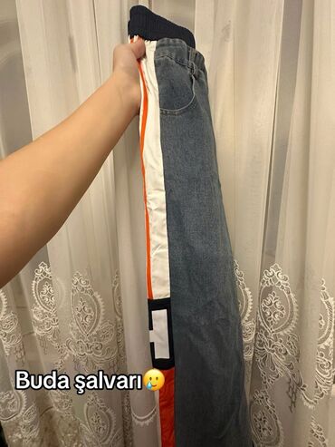 - Şalvar: cins material, yanlarda ağ-narıncı idman zolaqları və dekorativ hərf detalı; bel hissəsi elastik.
