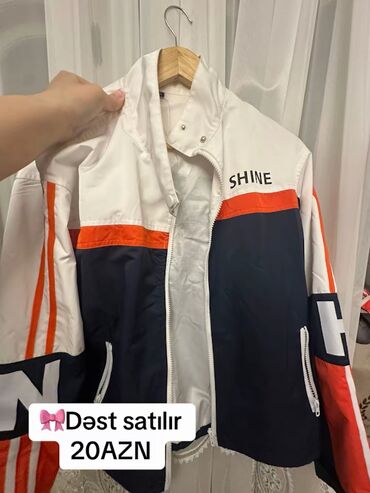 - Üst geyim: fermuarlı, yaxası zamoklu, rənglər – ağ, tünd göy və narıncı zolaqlar; ön hissədə “SHINE” yazısı; iki yan cib, fermuarlı.