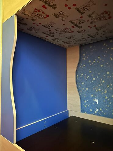İki mərtəbəli taxta çarpayı - Material: ağac teksturalı MDF/LDSP kombinasiya, təbii ağac görkəmli. - Quruluş: iki mərtəbə, yuxarı hissə üçün qoruyucu bort, yan tərəfdə inteqrə olunmuş taxta pillək...