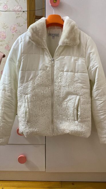 - Model 1: Krem/ivori rəngdə, yumşaq süni kürklü isti yaxalıq, ön hissədə məxməri-qipu (lace) fakturalı dekor, iki yan ciblə