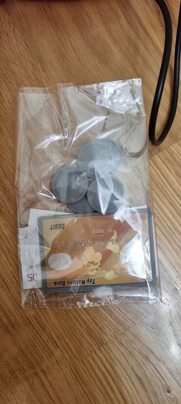 - “Toy Nations Bank” oyuncağı debet kartı, plastik sikkələr və banknot maketləri paketdə.