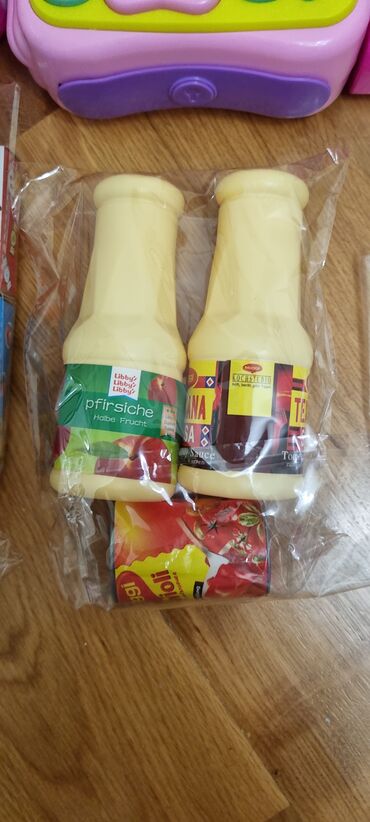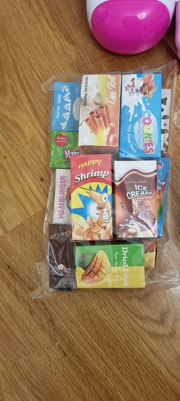 - Oyuncaq məhsullar dəsti: müxtəlif qutular (peçenye, dondurma, şokolad, quru meyvə, karamel, kraker, “hamburger”, “shrimp” qəlyanaltı və s.), konserv/qutu maketi, şüşə formalı iki ədəd sous/şirə maketi.