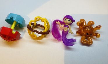 - Dəniz mövzulu balaca fiqurlar: bənövşəyi saçlı və quyruqlu kiçik su pərisi, yarımşəffaf narıncı ahtapot, iki ədəd plastik aksesuar/oyuncaqlar (halqa və iki rəngli fırlanan element).