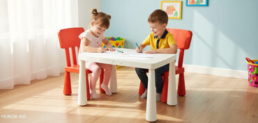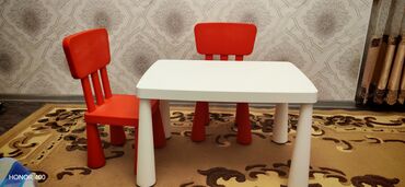Uşaq masa-stul dəsti - Komplekt: 1 ədəd kvadrat/aşağı hündürlüklü masa + 2 ədəd stul - Rənglər: masa – ağ, stullar – parlaq narıncı-qırmızı - Material: davamlı, yüngül və təmizlənməsi asan plastik...