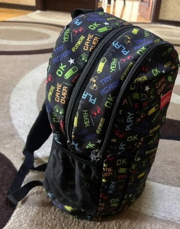 Uşaq məktəb çantası – Əla vəziyyətdə - Rəng: qara, üzərində “Ready to Play” yazılı rəngli qrafik elementlər və nişanlar