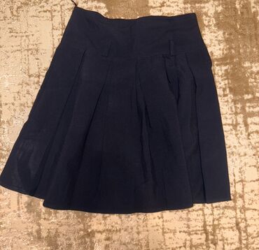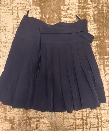 - Tünd göy pliseli ətək – yandan bağlama kəmər detallı, çox büzməli dizayn.