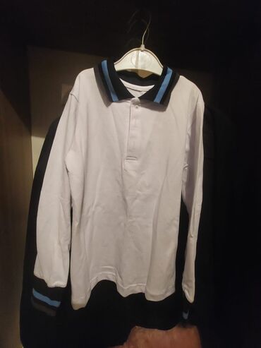 - Uzunqol ağ polo köynək, yaxa və qol ucları mavi-qara zolaqlıdır, ön hissədə düymələmə.