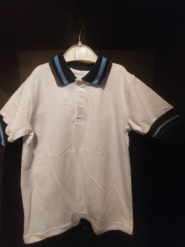 - Qısqol ağ polo köynək, eyni dizaynlı mavi-qara zolaqlı yaxa və qol kəsiyi.