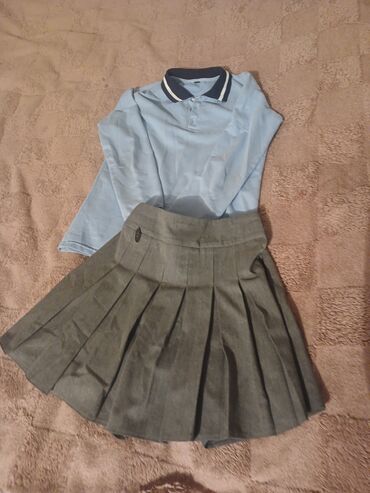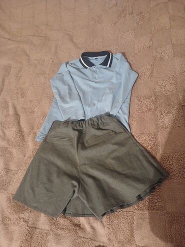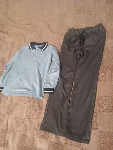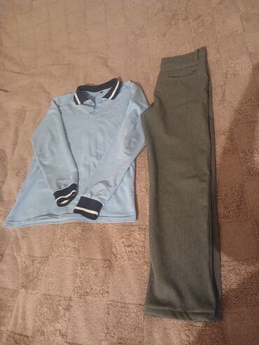 Açıq mavi rəngdə polo köynək və boz şalvardan ibarət uşaq məktəbli geyim dəsti. Şalvar yeni kimi(10 manat).Köynəklər işlənib biri 2 manat.34 razmer ver 36 razmer qisa qol ve uzun qollar