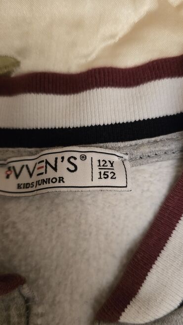 - Material məlumatı (etiketə əsasən): şalvar qarışıq parça (poliester, viskoza və elastan qarışığı qeyd olunub). Polo və kardiqan etiketi VVEN’S Kids Junior.