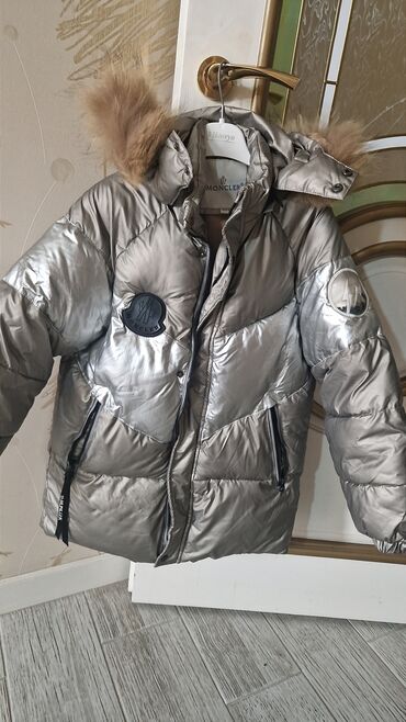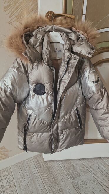 Uşaq qış kurtkası – kapüşonlu və süni kürk detalı ilə. - Rəng: metalik bənövşəyi/mavi ton, sinədə gümüşü parlaq panel. - Brend işarələri: ön hissədə dairəvi loqo patch, fermuar bağlarından MONCLER ...