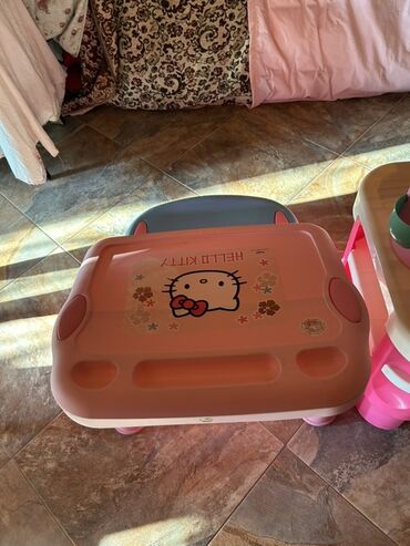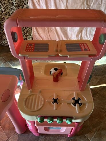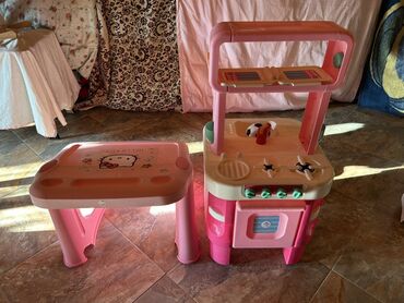 Uşaqlar üçün çəhrayı rəngdə oyuncaq mətbəx və stol dəsti. Mətbəx hissəsində ocaqlar, soba, lavabo və asma rəflər mövcuddur. Stol hissəsi Hello Kitty dizaynı ilə bəzədilmişdir və dərslər, oyunlar və ya digər yaradıcı fəaliyyətlər üçün uyğundur. Hər iki element plastikdən hazırlanmışdır və uşaqlar üçün təhlükəsizdir. Dəst uşaqların rol oyunları oynaması və təxəyyüllərini inkişaf etdirməsi üçün əla seçimdir.