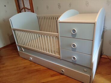 - Multifunksional dizayn: bir tərəfi barmaqlıqlı beşik, digər tərəfi 4 çekmecəli komod və üstü alt dəstləri üçün çevik masa kimi istifadə oluna bilər.
