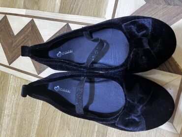 Qız uşaqları üçün klassik baletka. 34 razmer 8 m - Rəng: qara, parlaq lak örtüklü - Üst hissə: yumru burunlu, üzərində həcmli qara parça güllü bəzək - Daxili: açıq rəngli yumşaq içlik - Daban: aşa...