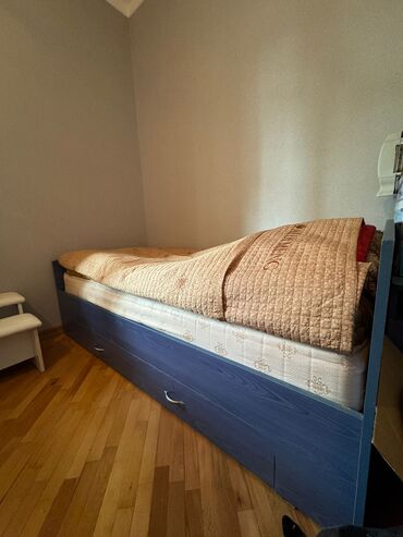 - Tək nəfərlik çarpayı: alt hissədə iri sürgülü/çekmece tipli saxlancla (2 ədəd tutacaq görünür). Madrat şəkillərdə mövcuddur.