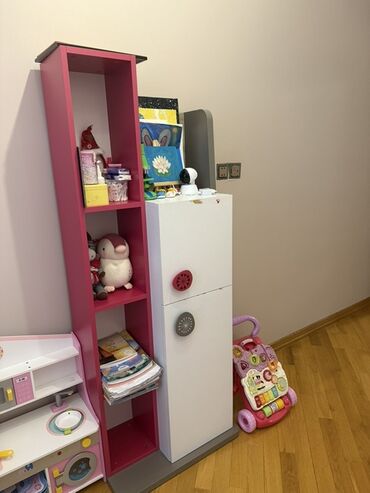 - Raf və dolab kombinasiyası – bir tərəfi açıq çəhrayı rəngli açıq rəflər, digər tərəfi iki bölməli ağ dolab; dairəvi dekor tutacaqlar.