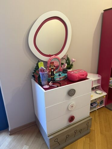 - Güzgülü komod – üstündə böyük oval güzgü (ağ/çəhrayı çərçivə), 3 geniş çekmece və altda ağac teksturalı çekmece; ön panellərdə dekorativ dairəvi və ürək formalı tutacaqlar.