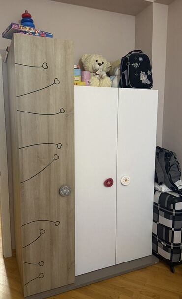 - Üç qapılı şkaf – sağ tərəf ağ, sol tərəf ağac teksturalı, ön tərəfdə ürək formalı naxışlar. Fərqli rəngli dairəvi dekorativ tutacaqlar.